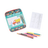 Include un carnetel cu instructiuni clare in pasi simpli pentru a desena 36 de vehicule, un carnetel de desenat, patru creioane colorate duble si un creion simplu cu guma de sters. Toate componentele setului vin intr-o cutie metalica frumos imprimata, reutilizabila, cu inchidere sigura prin fermoar.